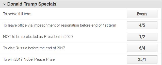 According to the bookies, the odds of Trump being impeached or stepping down before the end of his first term are about 50%.