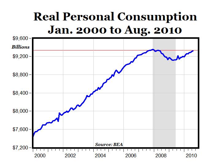 Double digit 'real' unemployment hasn't put a debt in equities or consumer spending, in spite of Paul Krugman's repeated cries for a bigger stimulus to prevent a recession. Apparently he hasn't seen Apple's latest earnings, which puts to rest any doubts about the propensity of Americans to spend in the face of adversity and uncertainty. Or this chart that shows the dip in personal consumption was temporary.